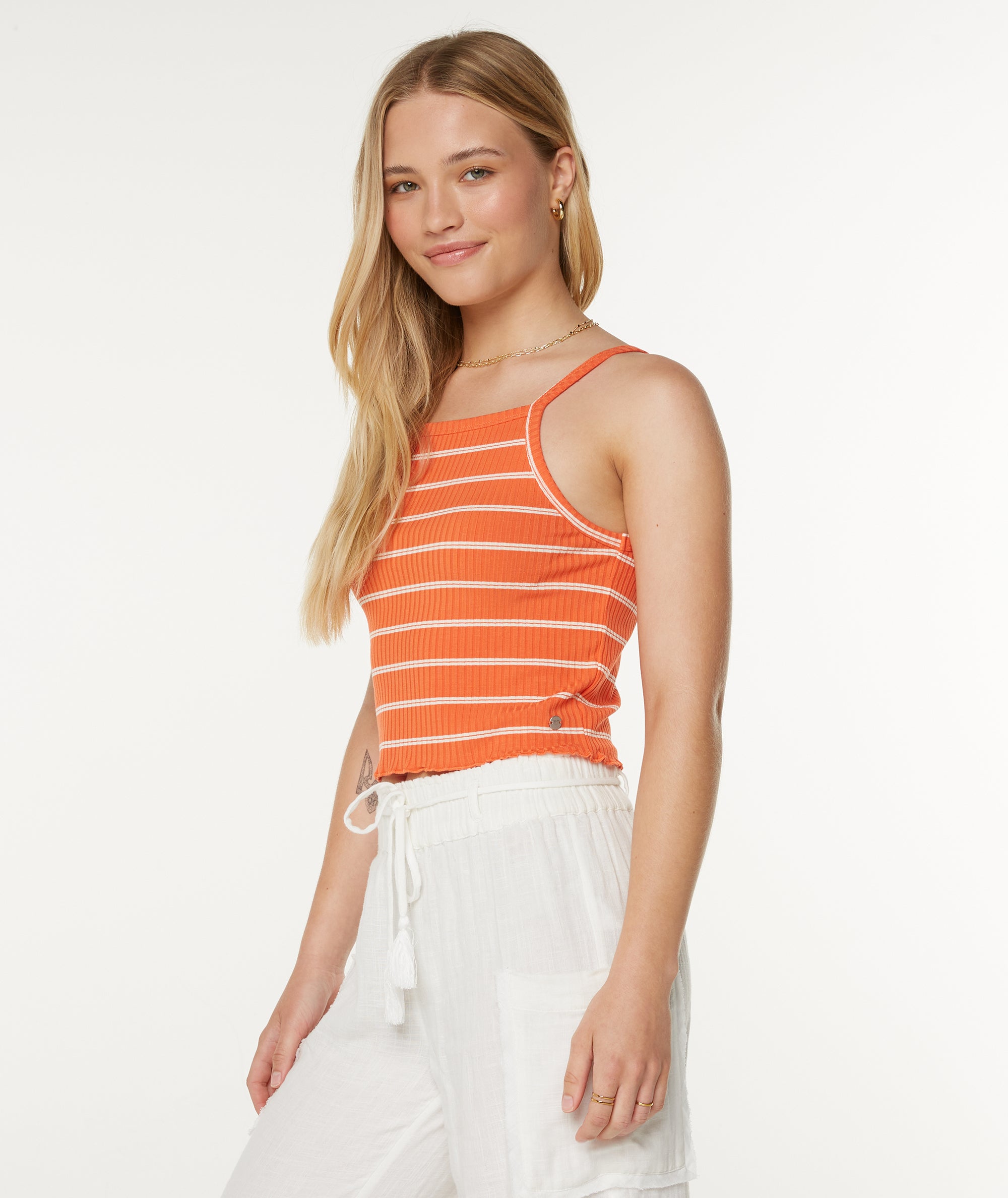 Embrace all the chic coastal vibes with the Cool Sunsetz tank. Featuring a high neck fit and a thin stripe pattern, this piece is the perfect elevated summer staple.