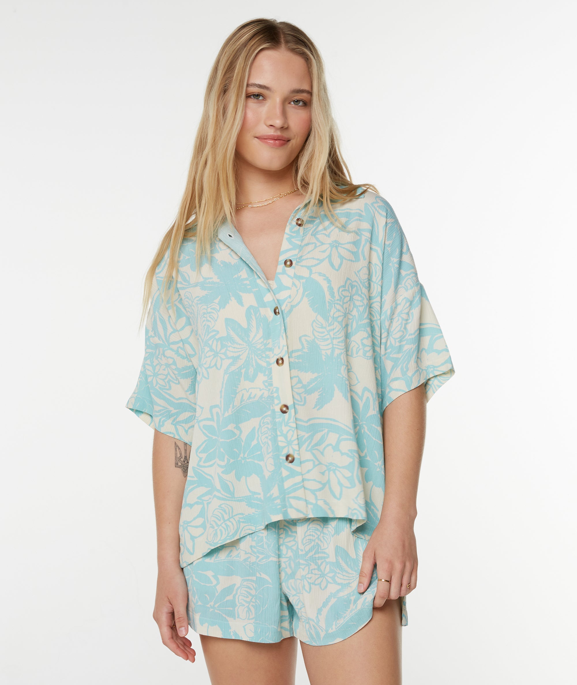 Get into the vacation state of mind in the Kokomo Camp shirt. Featuring a relaxed fit, wooden buttons and a tropical print, this top is a perfect layering piece or styled on its own.