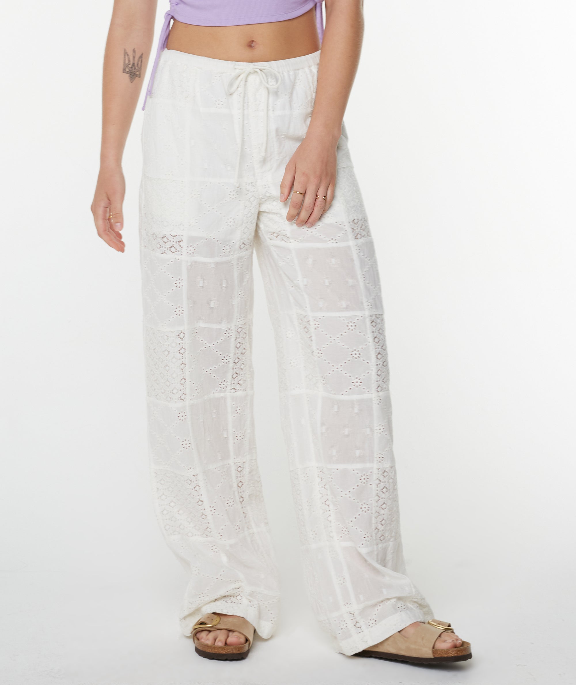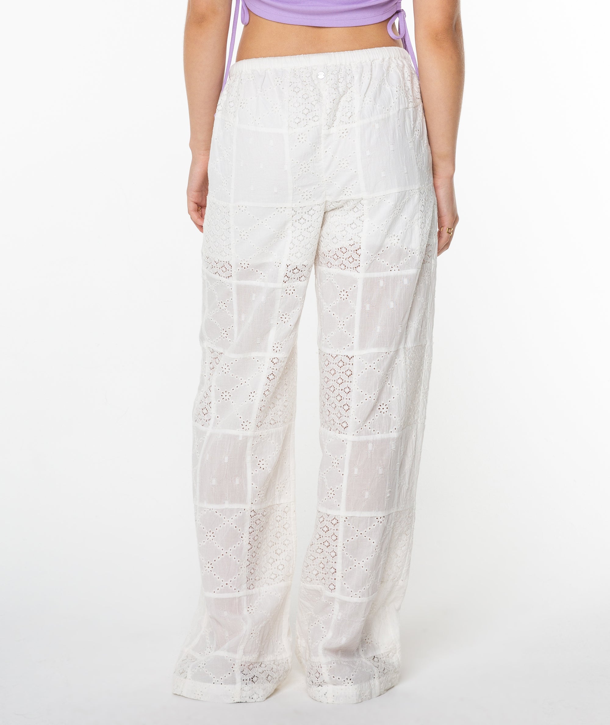 Make an elevated beachy statement in the Precious Patchwork pants. Featuring a half lining and open eyelet patchwork fabric, these pants effortlessly blend flirty elegance with comfort.